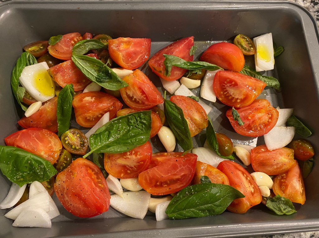 After doing my research into sauce, looking up several recipes on various websites, in the end I opted for the super simple method of roasting that first batch. I quartered the tomatoes, peeled a handful of garlic cloves, and cut up some onion. I arranged it all in a baking pan along with a good bit of fresh basil leaves and a little oregano. Then I drizzled on a generous amount of olive oil, sprinkled on some kosher salt and ground pepper, tossed it all together and popped it in the oven (375 degrees).