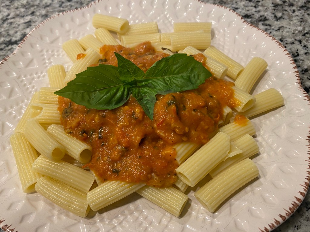 Result – super easy and beautiful looking sauce! I poured the sauce into a small saucepan just to warm it up before ladling it over a bed of ziti noodles. There it was – dinner was served!